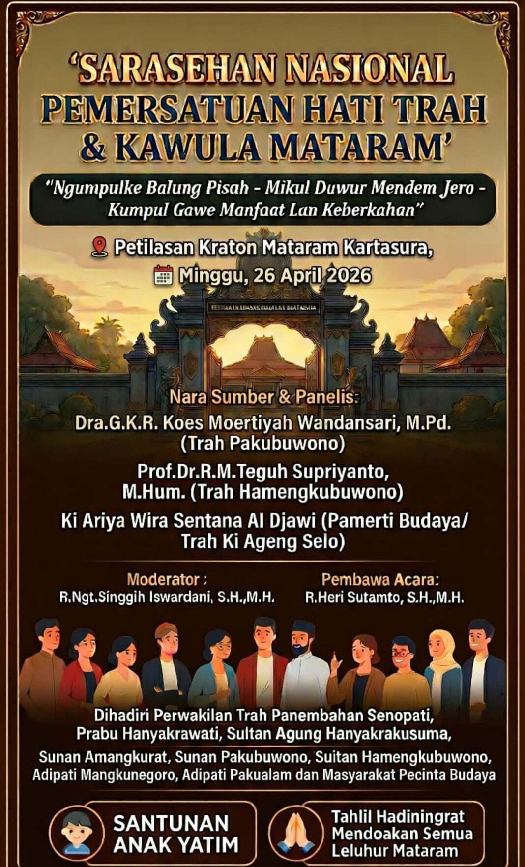 Acara akan di laksanakan di : Petilasan Kraton Mataraman Kartosura, Sukoharjo, Jawa Tengah. Di laksanakan Pada Hari minggu / 26 April 2026 , Waktu 13.00 – 15.00 WIB. Bisa di Ikuti Oleh Trah MATARAM & Masyarakat Pecinta Leluhur Mataran.